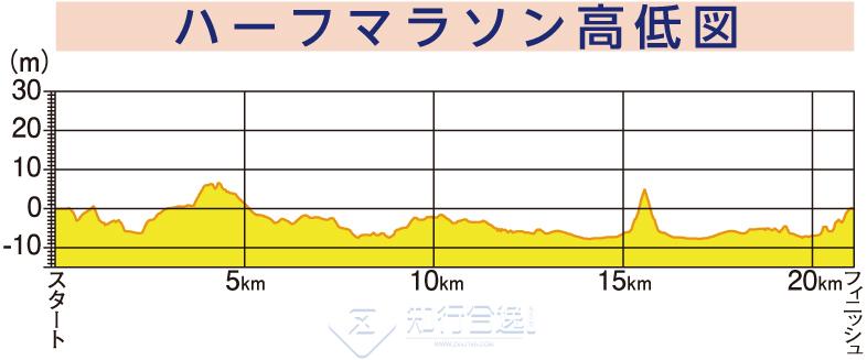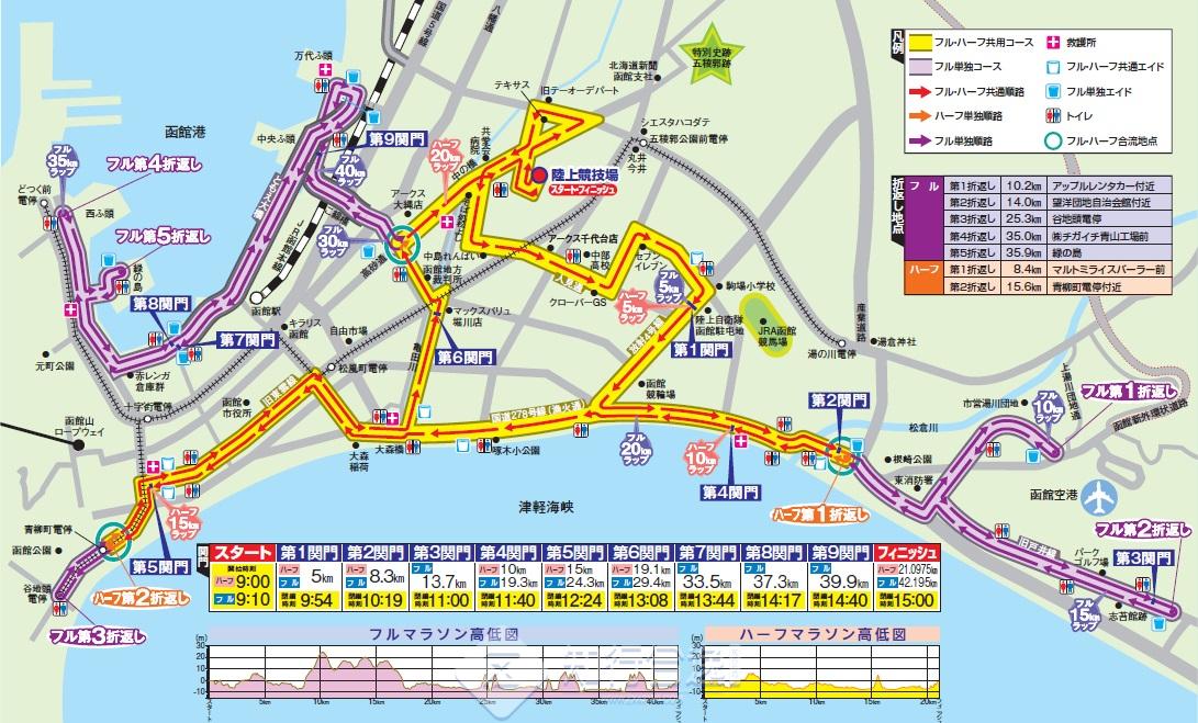 起点和终点都在千代台公园陆上竞技场。在竞技场上一圈后,穿过马拉松门,来到娱乐城,五峰郭。沿途办公大楼和商业设施林立。跑有面向津轻海峡的开放感的渔火通,在汤之川温泉街附近。在函馆机场附近是第一次的折返。如果运好的话,可以看到飞机的起飞和降落。折返后,跑向函馆山方面渔火通。大森浜有一座名为诗人石川啄木的座像的小公园。15-24公里间可以看到函馆山的山麓,跑过青柳町一带。沿着河道从龟田川到高砂通,跨越能够看到函馆港的汽车专用道路“灯火大桥”,到海湾地区。明治时期红砖仓库林立的这个地方,是代表函馆的观光地区。但是,请注意不要被石阶挡住脚。最后回到终点千代台公园陆上竞技场。
