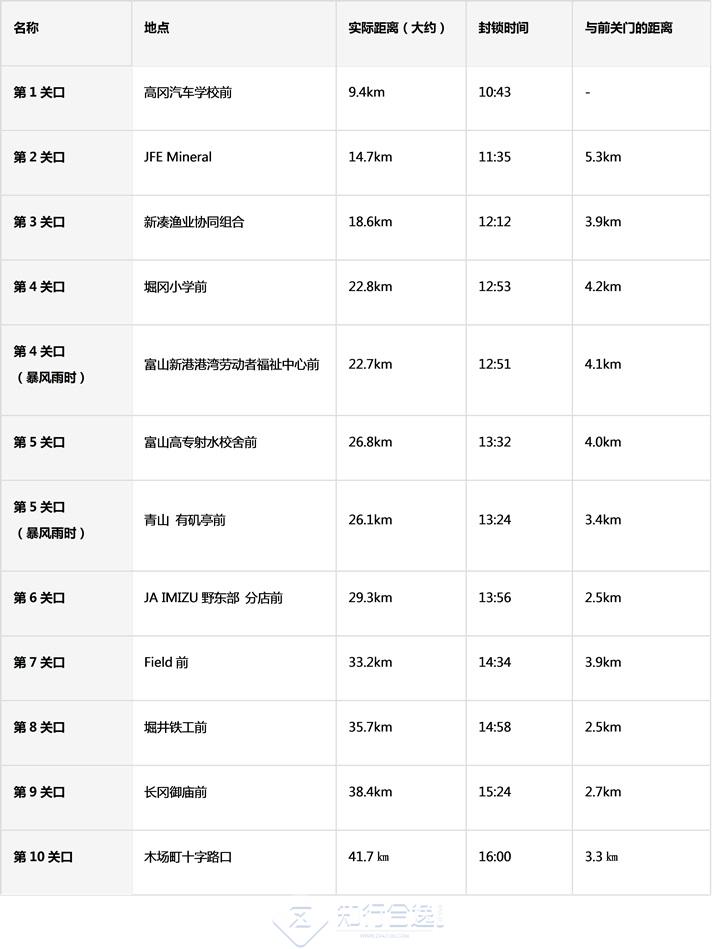 比赛起点在高冈市政府前,终点设在富山县富岩运河环水公园,赛道是日本陆连公认路线,高冈市政府前→高冈大佛→山町筋→新高冈站周边→海王丸公园→新凑大桥(当天如有暴风雨,有备用路线)→富山北大桥→富岩运河环水公园