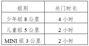 (四)关门时间和距离(以起跑枪声计算):为了保证参赛选手比赛安全、顺利,比赛期间比赛路线各段设关门时间,限时对交通封闭。起跑至关门时间到后,各路段恢复社会交通。参赛者在规定的关门时间内,未跑完对应距离的参赛者须立即停止比赛,退出赛道,以免发生危险。退出比赛者可乘坐组委会提供的收容车到相应项目的终点。