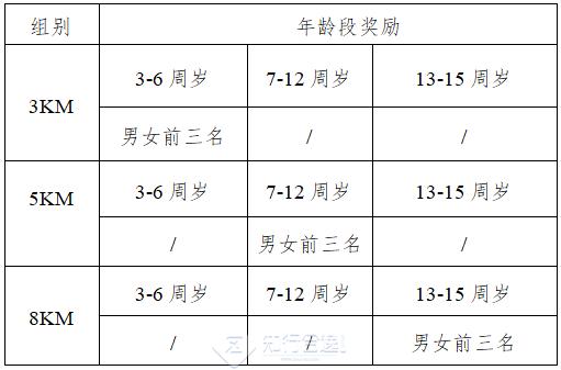 注意:比赛鼓励低年龄挑战更高组别,选手满6周岁也可报名参加5KM、8KM组别比赛,但无法获得个人奖励,各组别的个人奖励将严格按照组别的年龄分组进行排名。