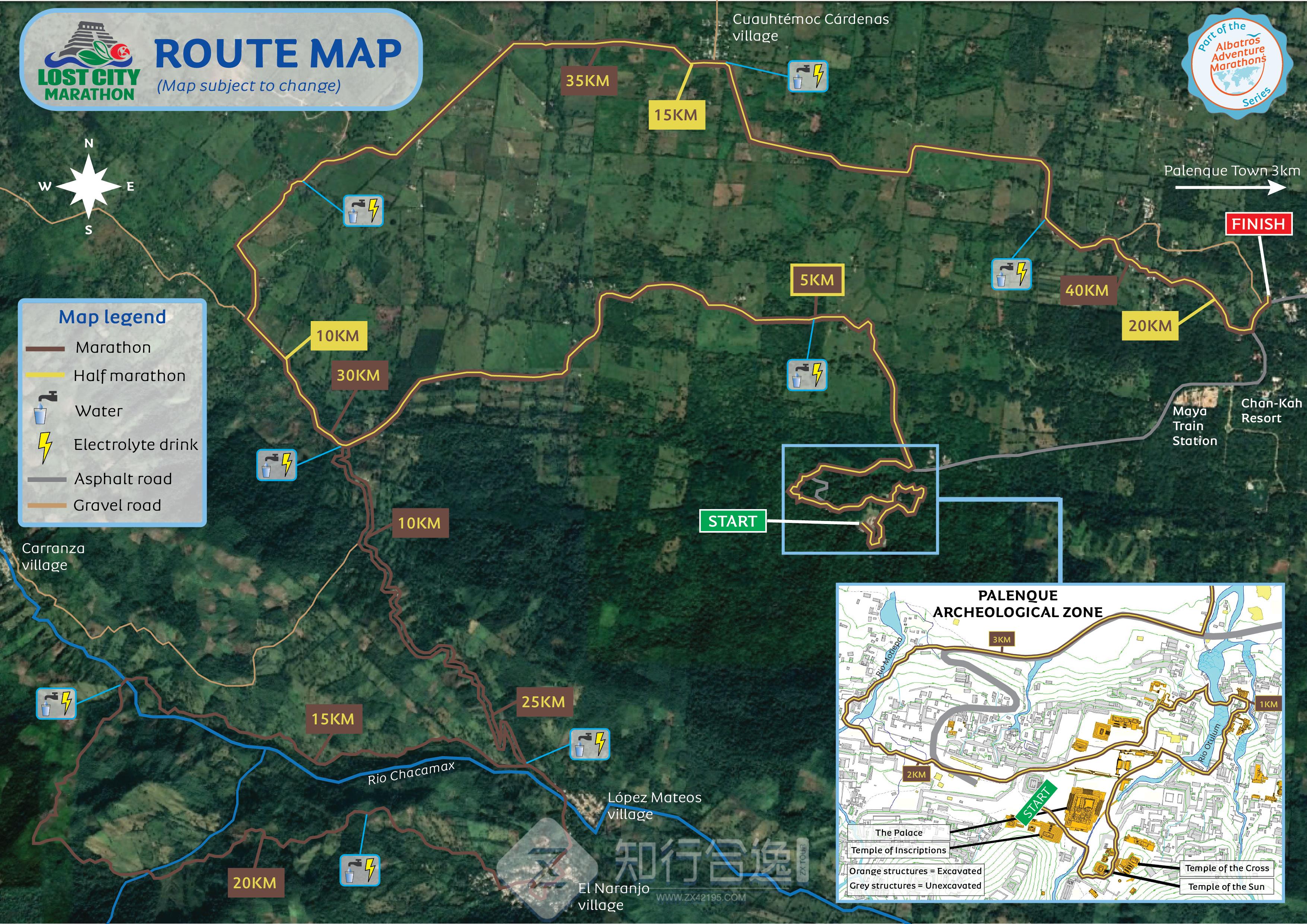 比赛正是从帕伦克考古区出发,带您穿过茂盛丛林中这座伟大的古玛雅城市的遗迹。3 公里后,路线过渡到下坡的柏油路,直到左转进入碎石路。继续前行几公里,路线接近山麓,并开始逐渐上升。半马选手将在这里右转,在碎石路上绕一个相对平坦的环路,绕过风景如画的牧场,经过卡德纳斯村,到达终点线。