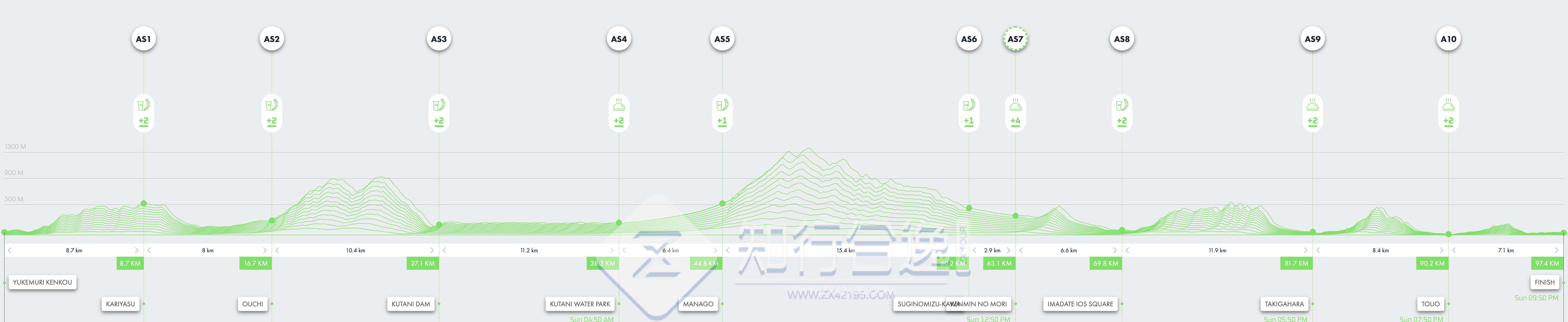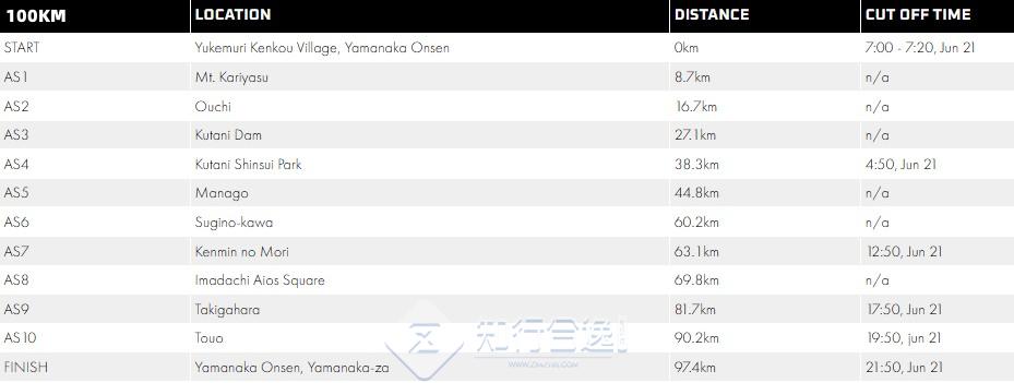 100公里和50公里的比赛从山中温泉中心开始,20公里的比赛在石川县立森林开始,从山中温泉乘坐穿梭巴士约30分钟。
