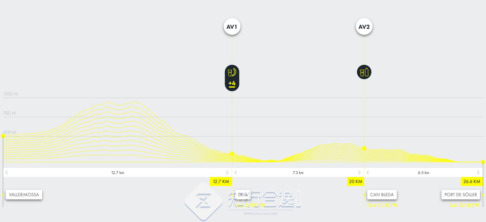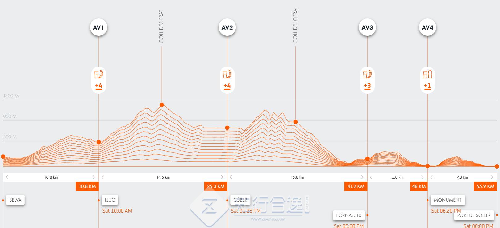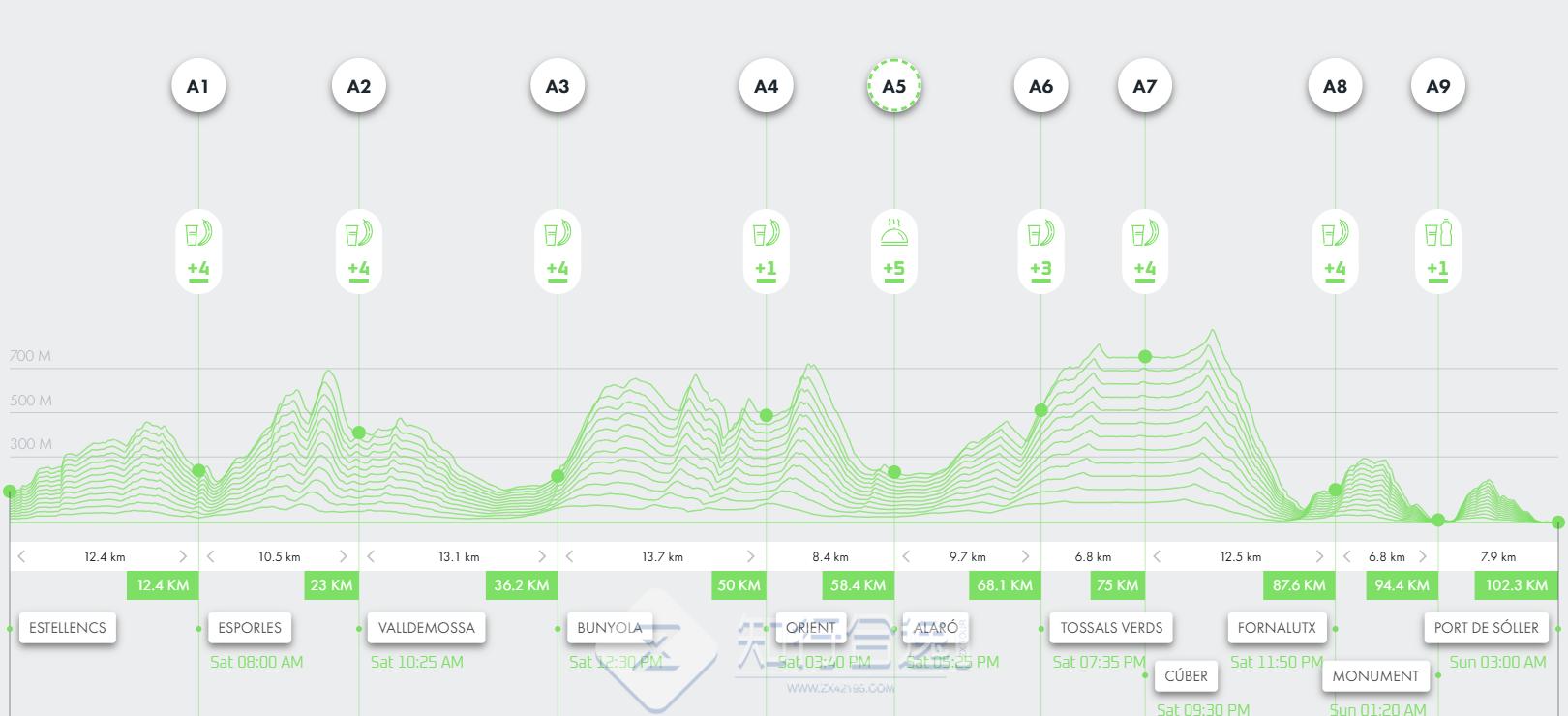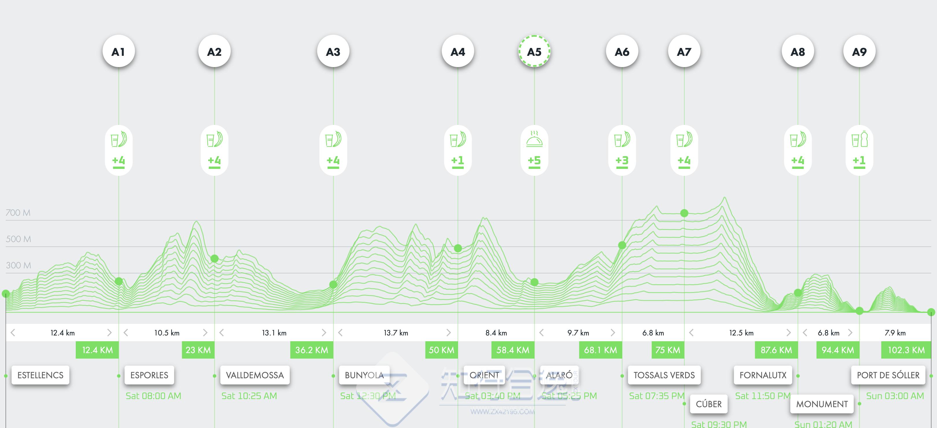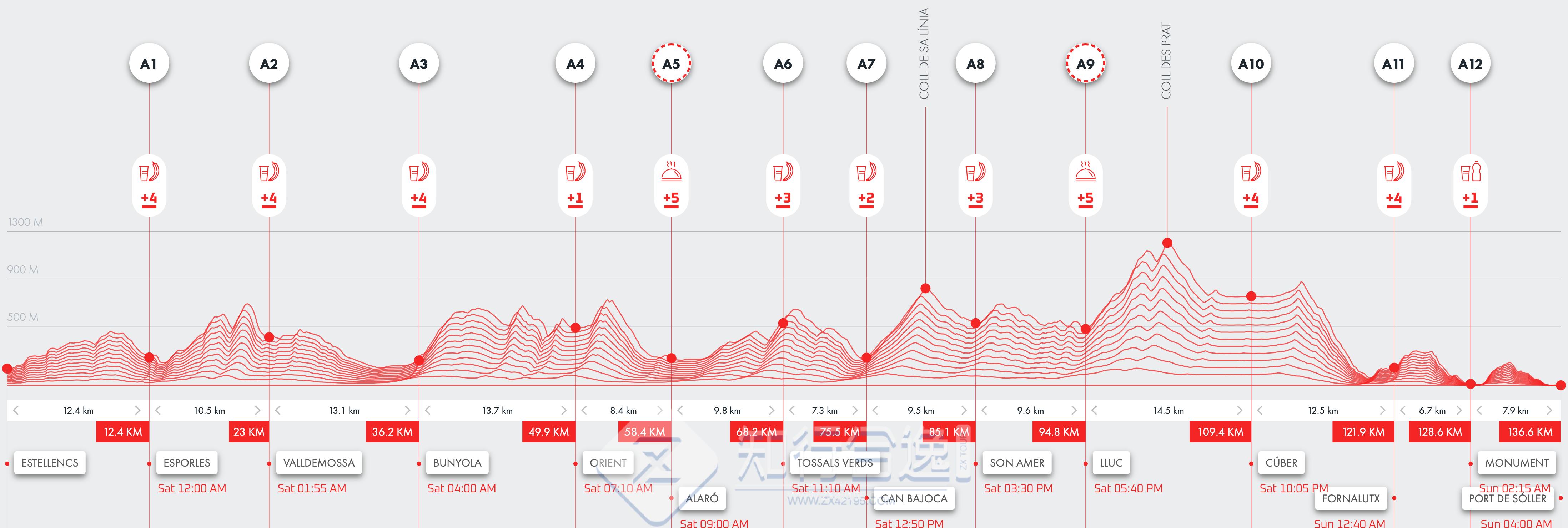 100公里:从Estellencs 出发,沿着卡米代斯·科雷乌(Camídes Correu)到埃斯波尔莱斯(Esporles),穿过历史悠久的村庄,如Valldemossa、Bunyola、Orient、Alaró和Fornalutx,穿过Escorca市,从第一公里开始,这条赛道就让你沉浸在最狂野、最真实的马略卡岛。最终在索勒港的海湾越过终点线.