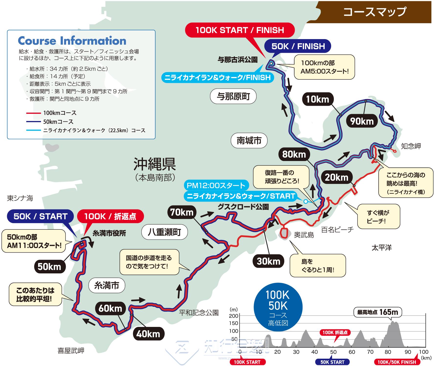 100公里起点与那古浜公园,50公里起点糸満市役所(糸満市),22.5公里グスクロード公園(南城市)