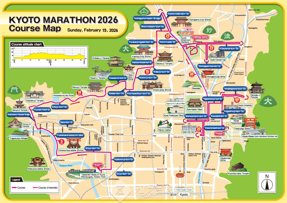 这场马拉松是一条世界遗产的观光路线,日本全国共有21处世界文化遗产,而这场马拉松可以经过七处!从西京极综合运动公园出发,经过天龙寺、仁和寺、龙安寺、金阁寺、上贺茂神社、下鸭神社、银阁寺七大世界文化遗产, 一路体会京都幽静古刹的传统之美。