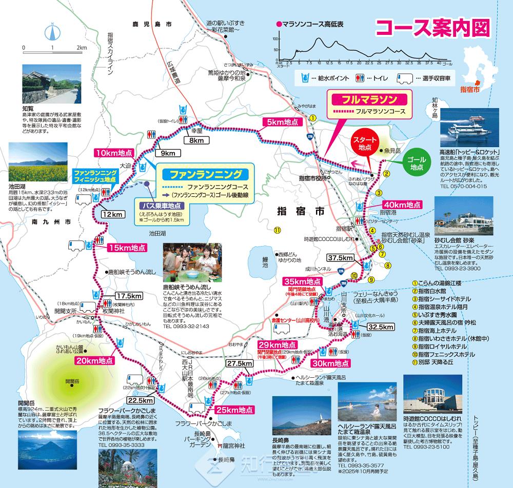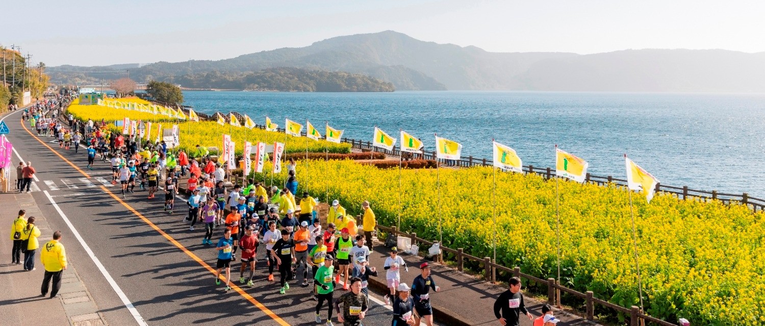 赛事起终点均设在指宿市陆上竞技场周边,路线有一段沿着海岸线,还会跑过大片的油菜花田,风景非常美。