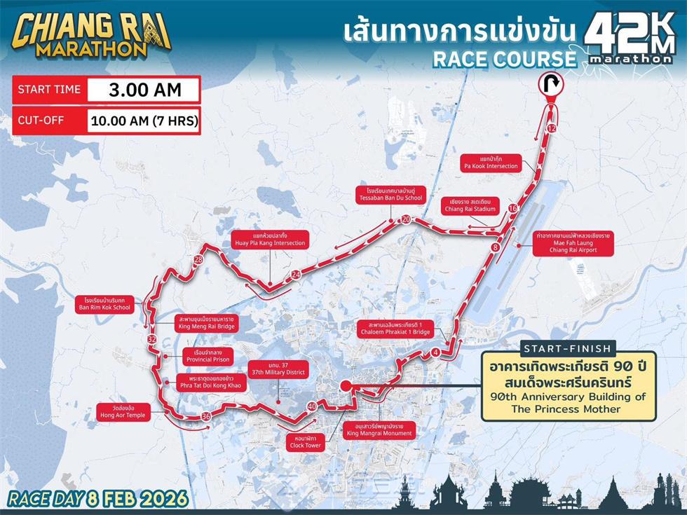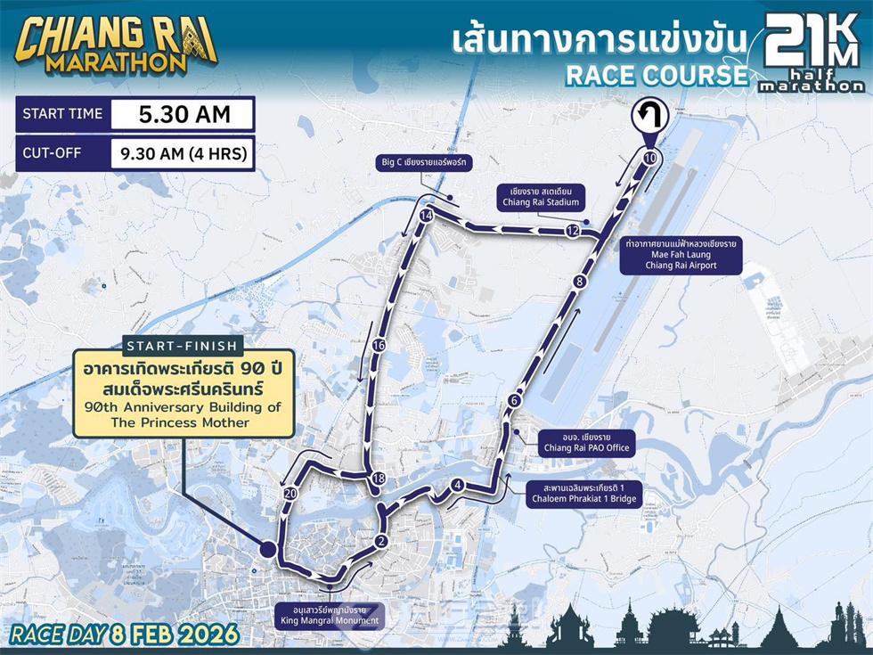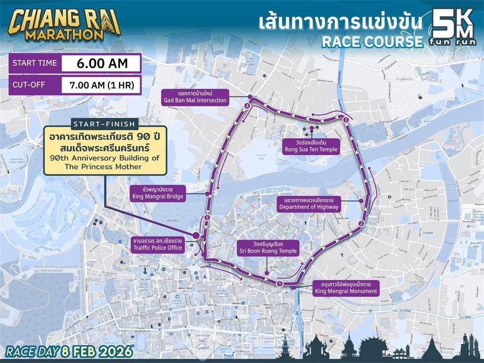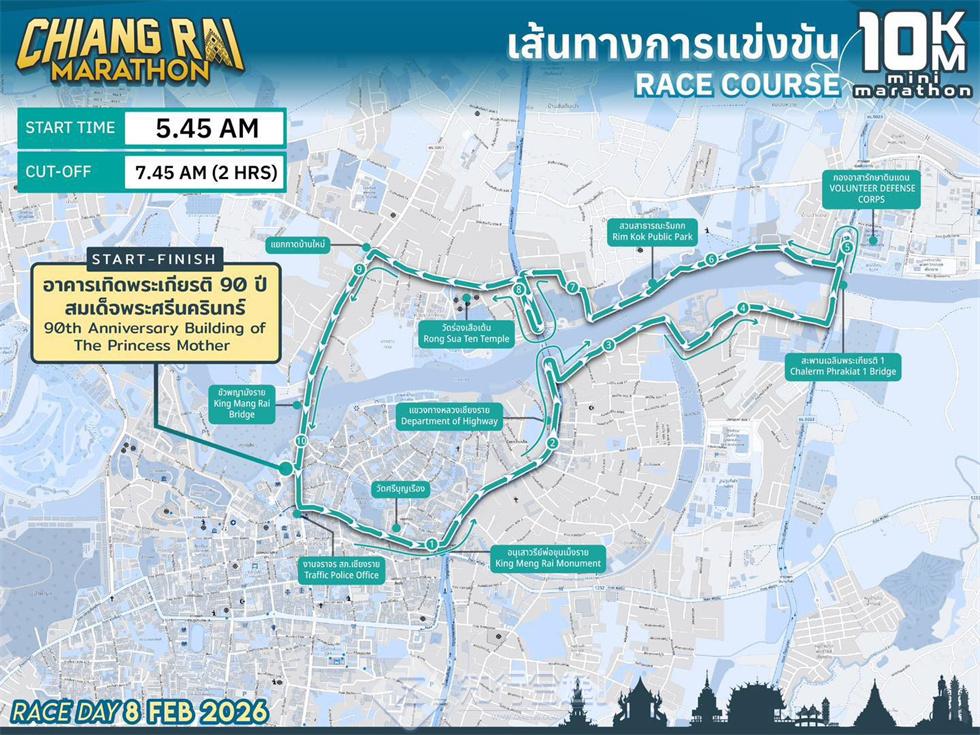 清莱马拉松起终点就位于旧清莱市政厅,也称为老房子。清莱马拉松的赛道设计每年可能略有调整,但通常会经过一些清莱标志性景点和美丽的自然风光,让参赛者在奔跑中感受这座城市的魅力。