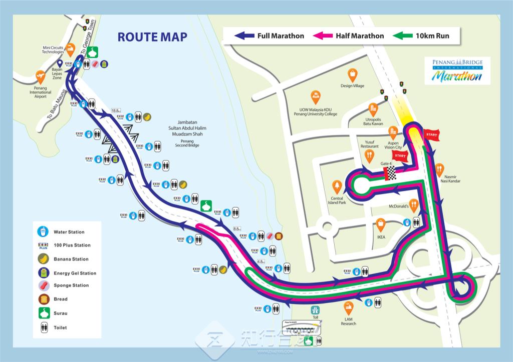 这场马拉松的最大特点就是在跨海大桥上跑!主要赛道都在槟城第二大桥上,这座大桥正式名称为苏丹阿都哈林大桥,位于槟岛海峡南部水域,连接槟岛东南部的巴都茅和威省的巴都加湾,大桥全长24公里,其中16.9公里跨越大海 !建成时这座大桥是东南亚第一长跨海大桥,不过现在让位于2020年建成的汶莱的苏丹奥玛阿里赛夫汀跨海大桥(30公里),变成第二长啦,这两座大桥都有咱们基建狂魔的参与。远处望去,大桥如同一条巨龙,蜿蜒横卧于蔚蓝大海之上,壮观之极,这里就是你的赛道,比赛当日大桥将封路给你跑!