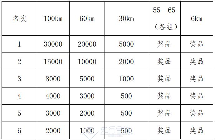 为激励更多选手参赛,本次越野赛特别设置了奖金;每个组别分男女前六获得不同的奖金或奖品装备等奖励;商学院组与55—65岁选手将单独获得排名及奖品奖励。所有完赛运动员颁发完赛奖牌及完赛包。