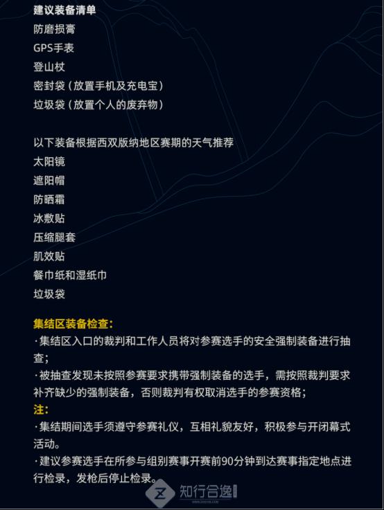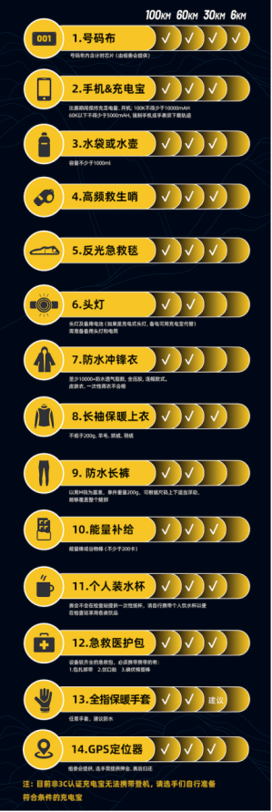 (1)参赛选手在领取参赛物品前,必须携带安全强制装备清单中所有装备接受检查,不符合条件者将无法领取参赛物品;