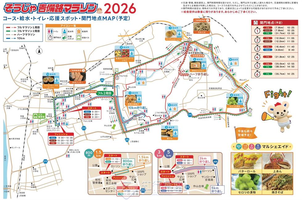 比赛从总社商工会馆东交叉口出发,终点在体育中心。沿途各补给站将与市内商店合作,提供当地特色美食和参赛餐,在总社吉备路马拉松中,感受历史、文化和美食的魅力!