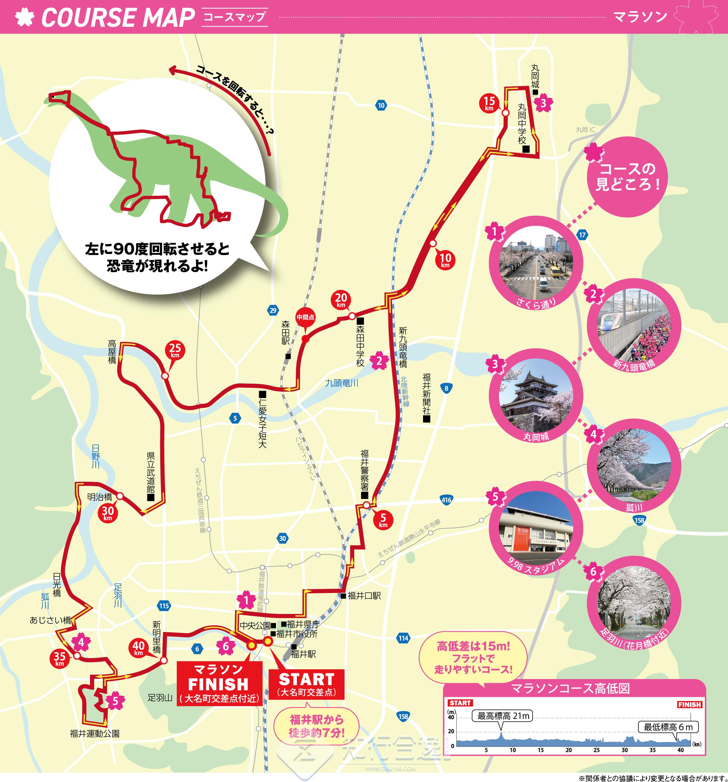 起点和终点位于福井站前,交通便利,路线设计灵感来自于恐龙,赛道平坦易跑,高低差不大(日本田径联合会认证/国际田径联合会及AIMS(国际马拉松及公路跑协会)认证路线)