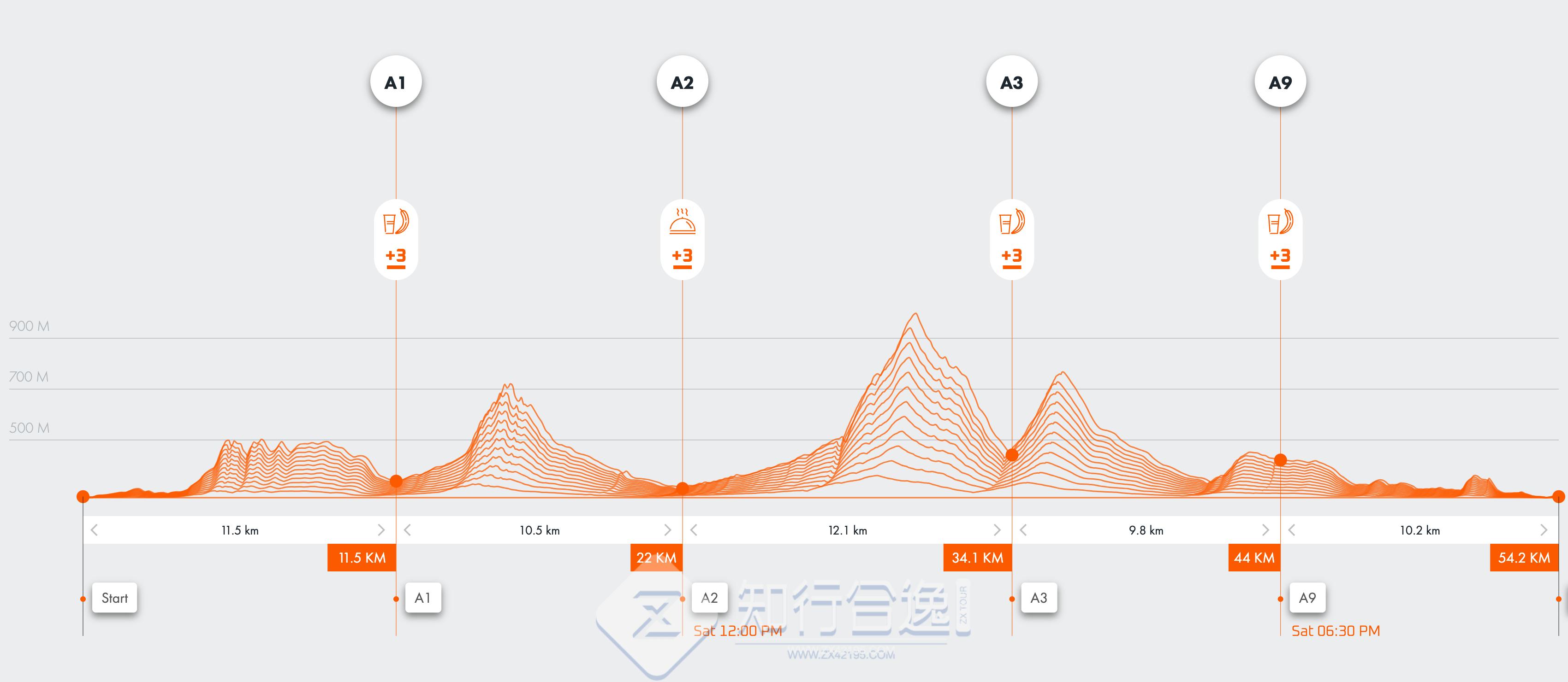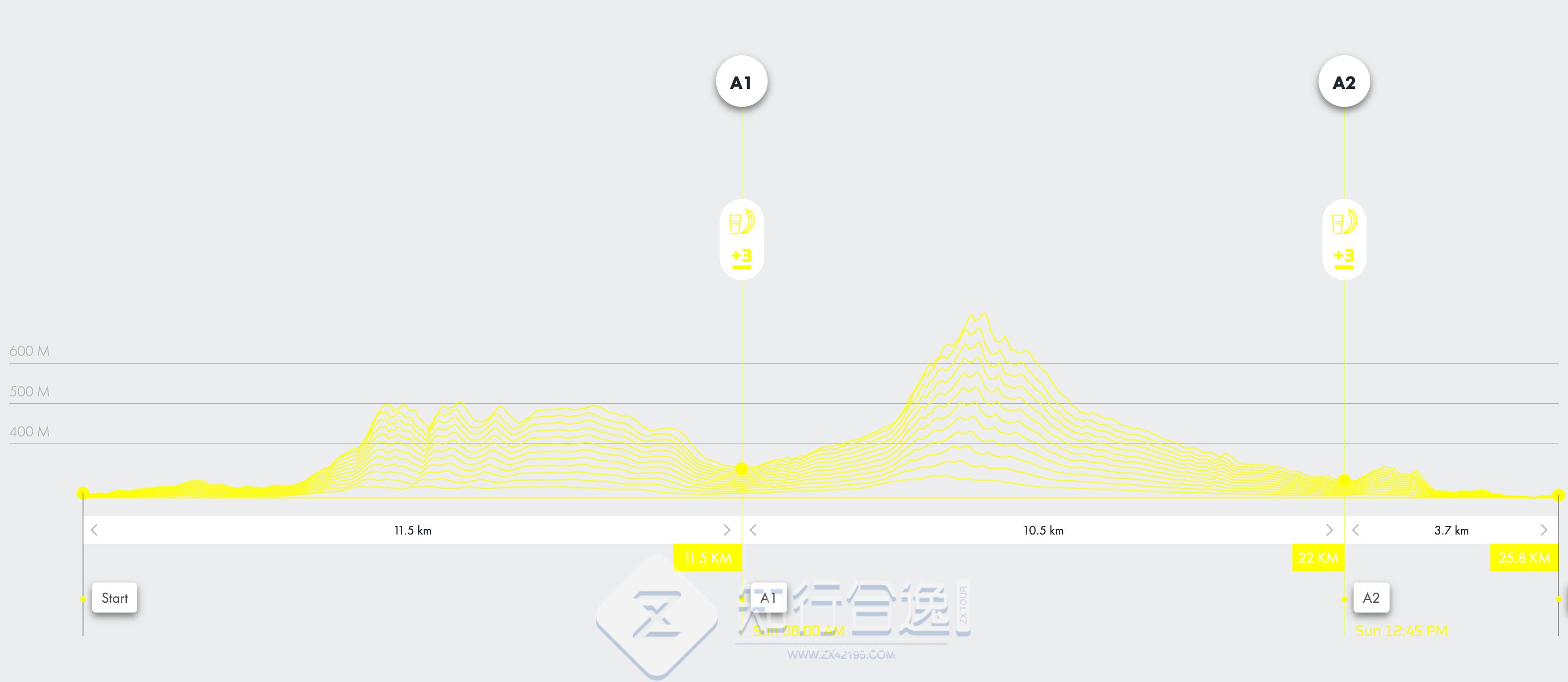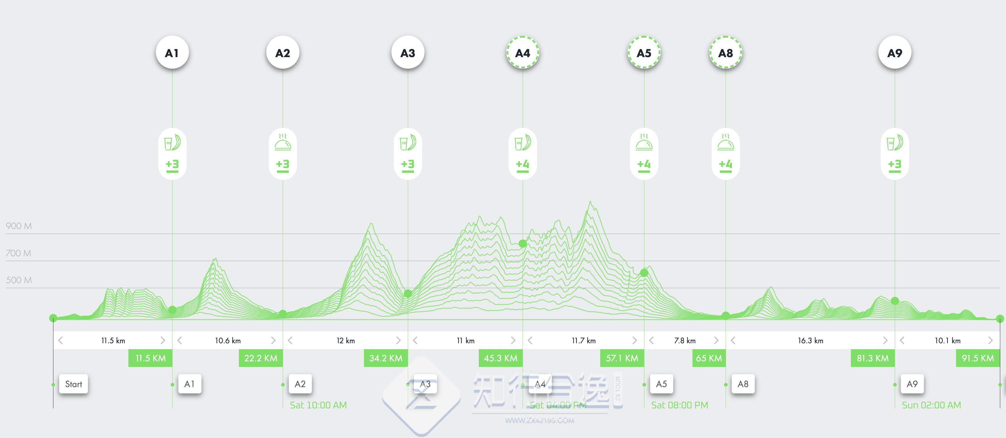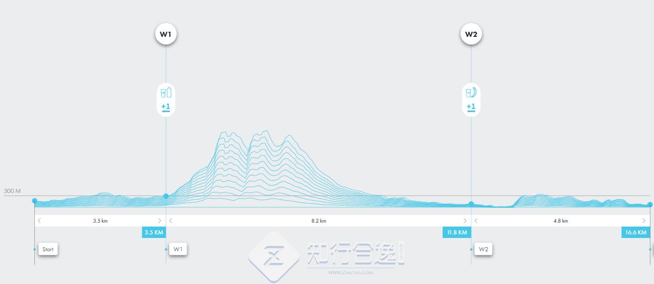 第一个组别难度稍微大点,该组别被称之为「Mist 20K」,我们就叫它迷雾20公里吧。总长度24公里,累计爬升1090米,5月3日早上5点起跑,9小时关门。