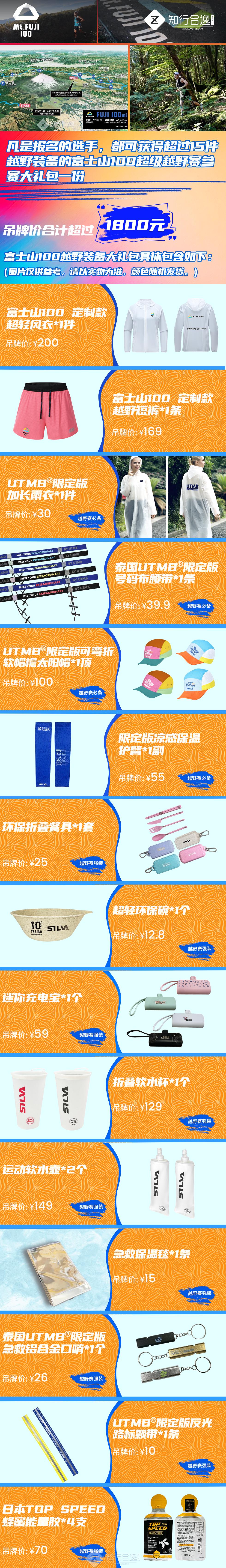 醒目:通过知行合逸报名赛事,均赠送组委会官方出品的富士山100限定版神秘装备! 以及知行合逸赠送的包含15件越野装备的富士山100参赛大礼包一份!
