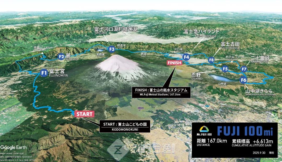 FUJI100英里组:实际距离约167.0公里,累计海拔爬升+6,613米, 起点富士山儿童之国(静冈县富士市),终点富士北麓公园富士山铭水体育场(山梨县富士吉田市)
