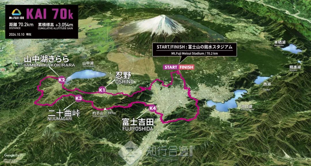 KAI70 公里组:实际距离约70.2公里,累计海拔爬升+3,052米,起终点都在富士北麓公园富士山铭水体育场(山梨县富士吉田市)