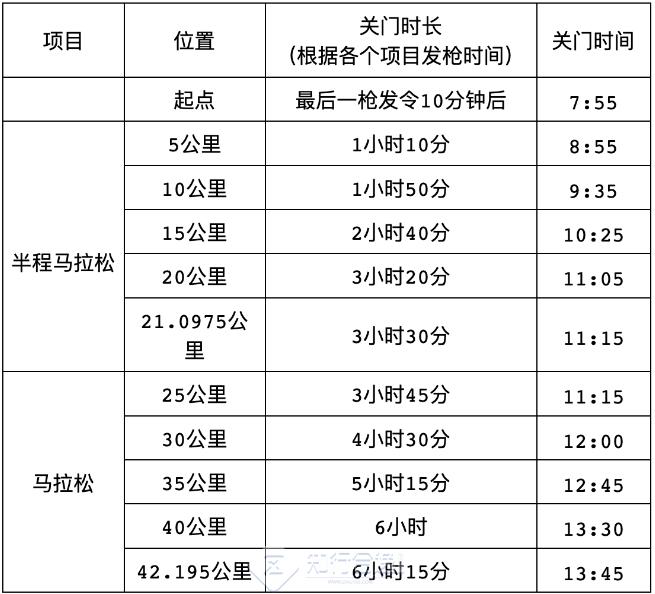 为保证参赛选手比赛安全、顺利,限时对社会交通进行滚动封闭。比赛路线各段专设了赛时关门时间,关门时间后,相应公里点的计时毯停止工作,相应路段将恢复社会交通。在规定关门时间内,未跑完对应距离的参赛选手须立即停止比赛,退出赛道,以免发生危险。退出比赛的选手可搭乘组委会提供的收容车或自行选乘公共交通抵达相应项目的存取衣物处。
