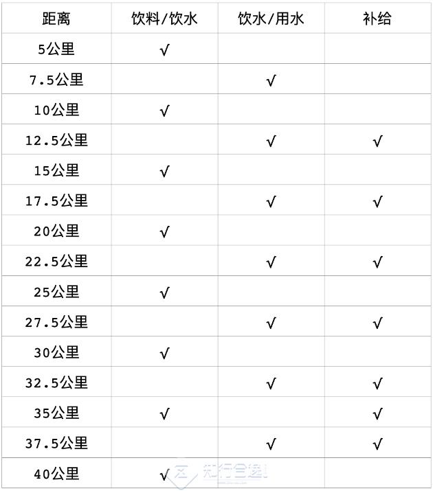 1、饮料、饮水、用水站:自起点开始大约每5公里的间隔距离设置一个饮料/饮水站,两个饮料/饮水站中间设置饮水/用水站。