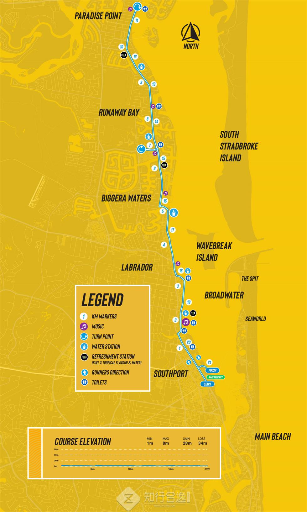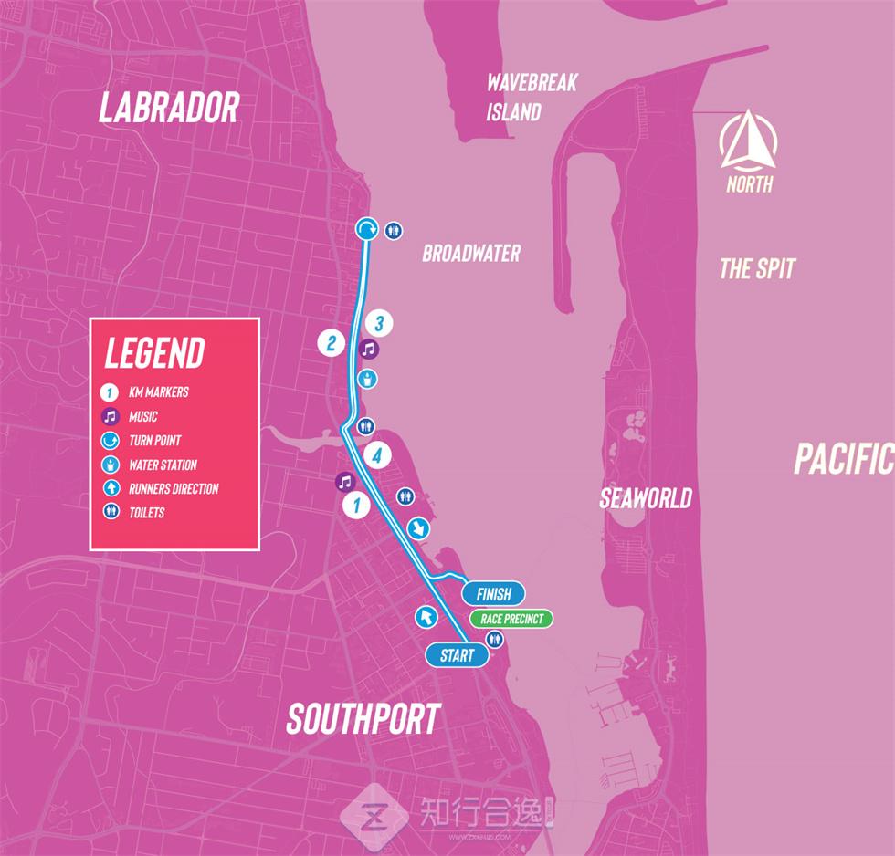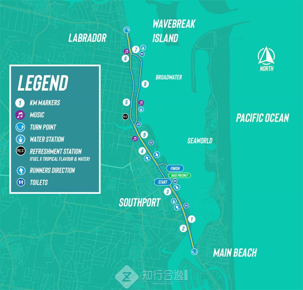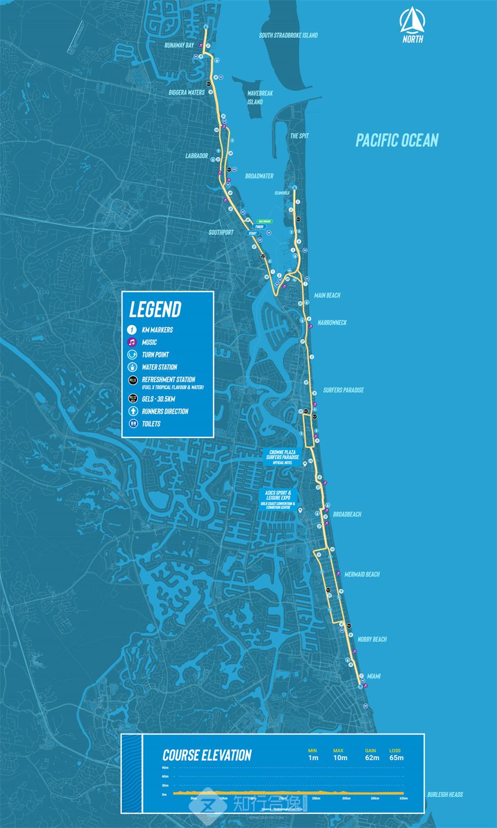 澳大利亚黄金海岸马拉松在昆士兰的黄金海岸举行,赛道平坦气温舒适,主要是环绕海岸线一圈,起终点都在南港滨水公园附近的内朗街,AIMS认证赛事。