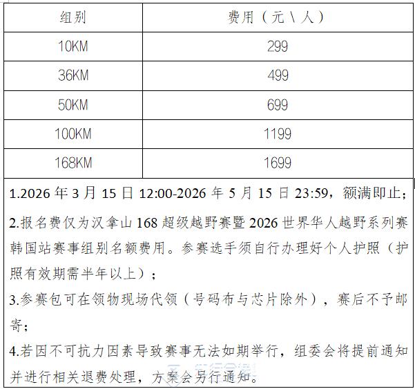 (一)赛事名称:汉拿山168超级越野赛站暨2026世界华人越野系列赛韩国站