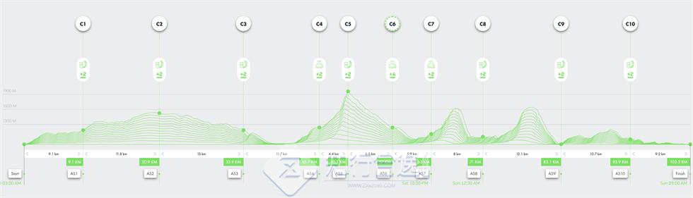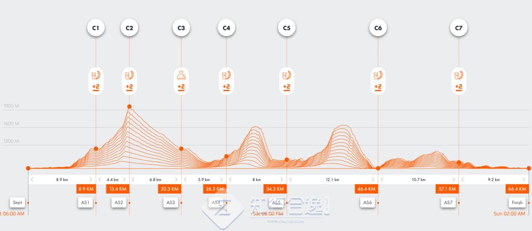 终极远征 60K:累计距离65.9 km,累计爬升3,348 m+。6 月 13 日早上 6 点起跑。关门时间 20 小时。完赛可以获得2块宝石。跑进男女前三直接获得勃朗峰OCC名额;18 岁以上可以报名。