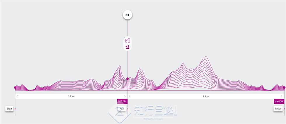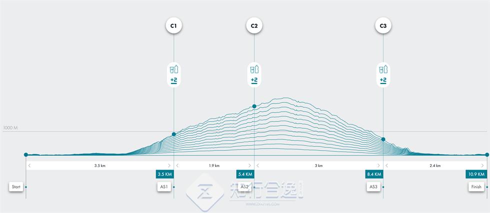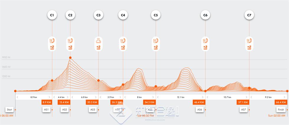 累计距离65.9公里,累计爬升3,348米,关门时间20 小时。完赛可以获得2块宝石。跑进男女前三直接获得勃朗峰OCC名额;