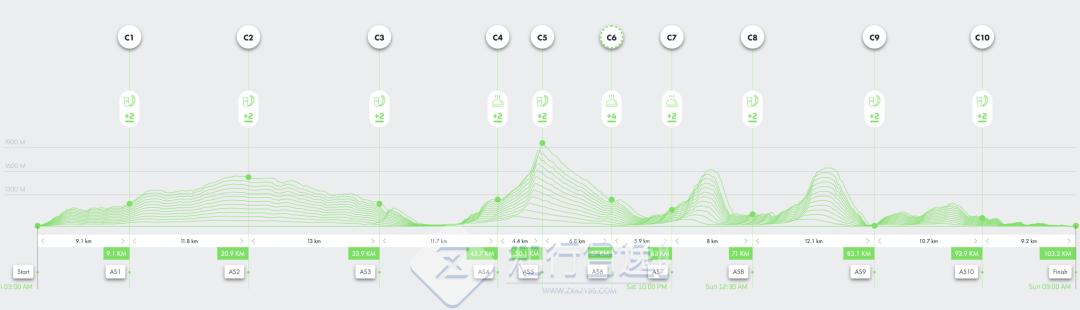 火山之冠 100K:累计距离102.2 km,累计爬升4,506 m+。6 月 13 日早上 3 点起跑。关门时间 30 小时。完赛可以获得3块宝石。跑进男女前三直接获得勃朗峰CCC名额;18 岁以上可以报名。
