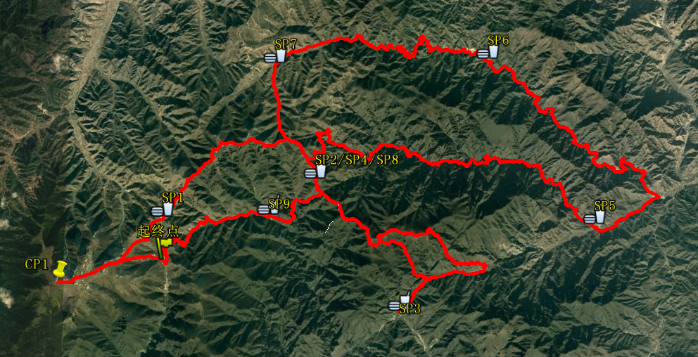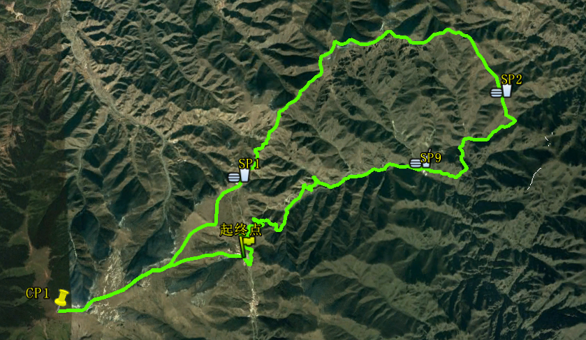 50公里:灵山停车场——东灵顶——九龙洼——无名二——无名一——北灵信号塔——落叶谷垭口——实心楼——留言壁——黄草梁——十里坪——王大台——柏峪——象鼻山——留言壁——实心楼——落叶谷垭口——寺上——椴木沟——灵山停车场