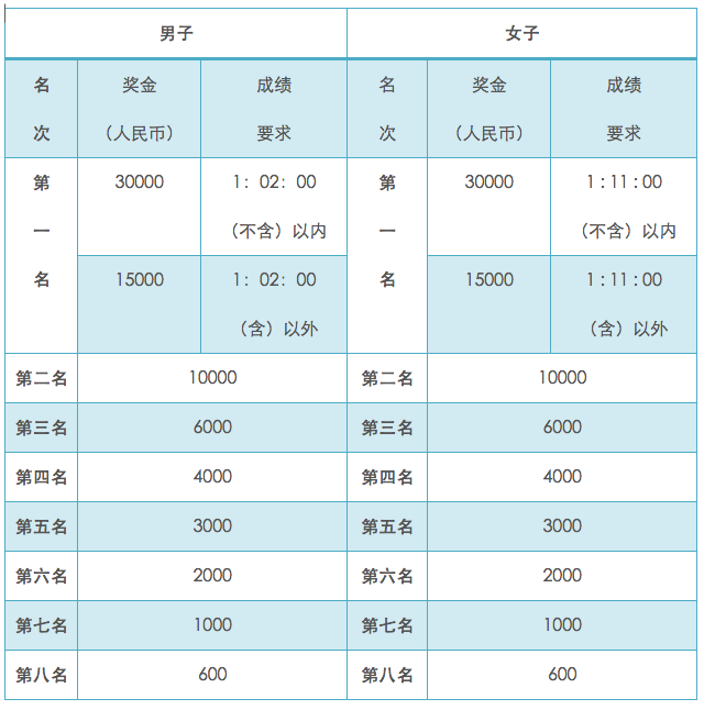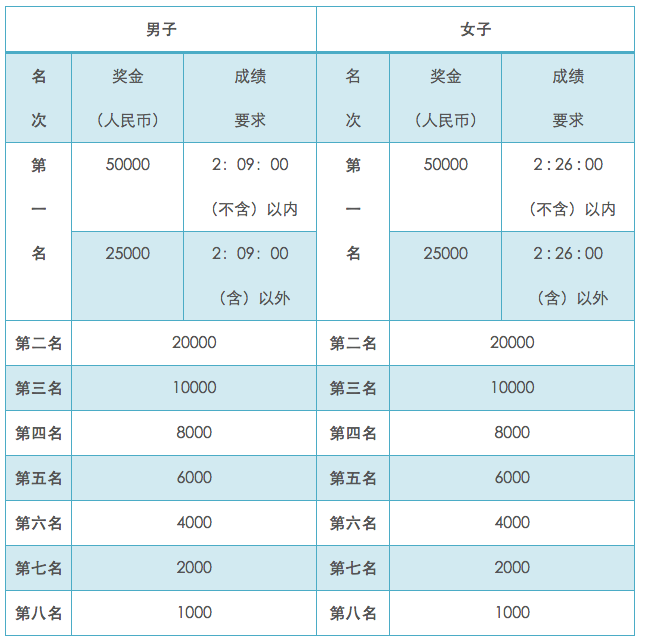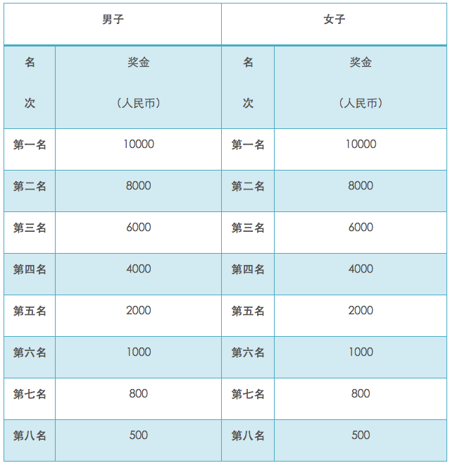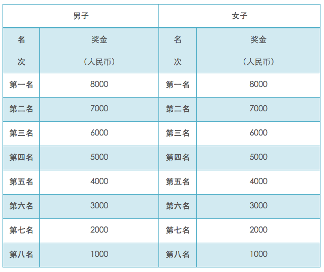 中国籍运动员达到如下成绩要求并获得中国籍运动员男子和女子前八名,将分别获得奖金(见下表)。